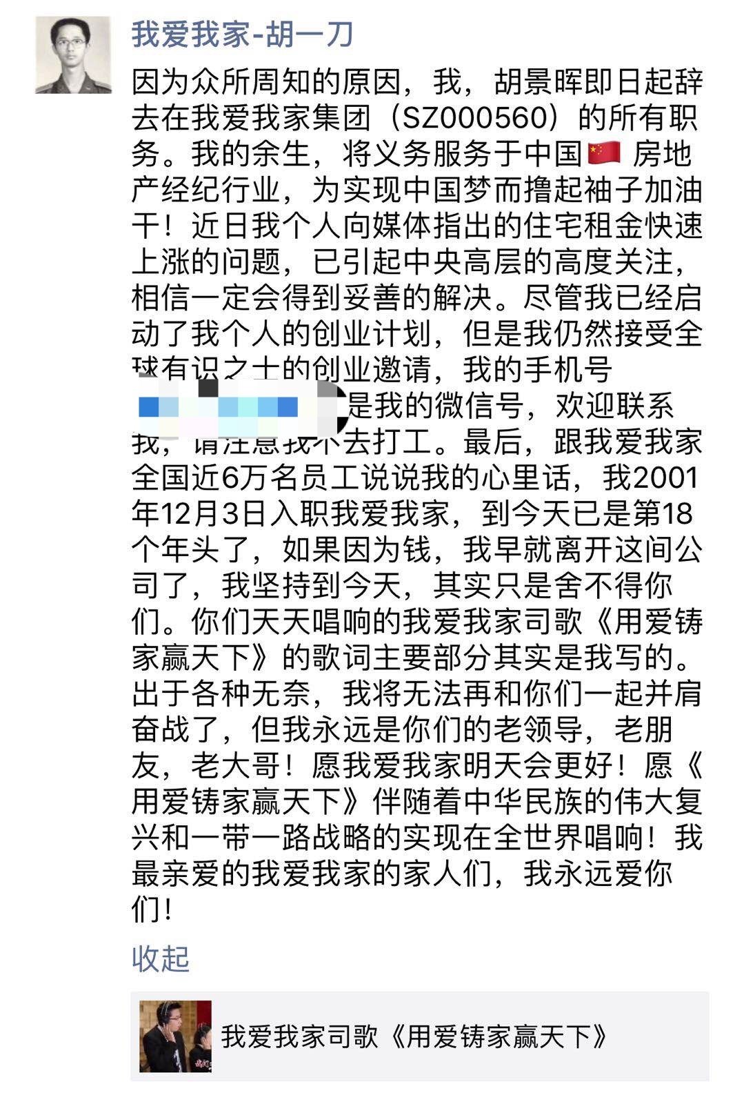 8月18日消息,我爱我家副总裁胡景晖微信朋友圈表示,“我,胡景晖即日起辞去在我爱我家集团的所有职务。