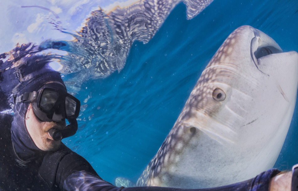 德国水下摄影师Markus Roth和鲸鲨在一起。