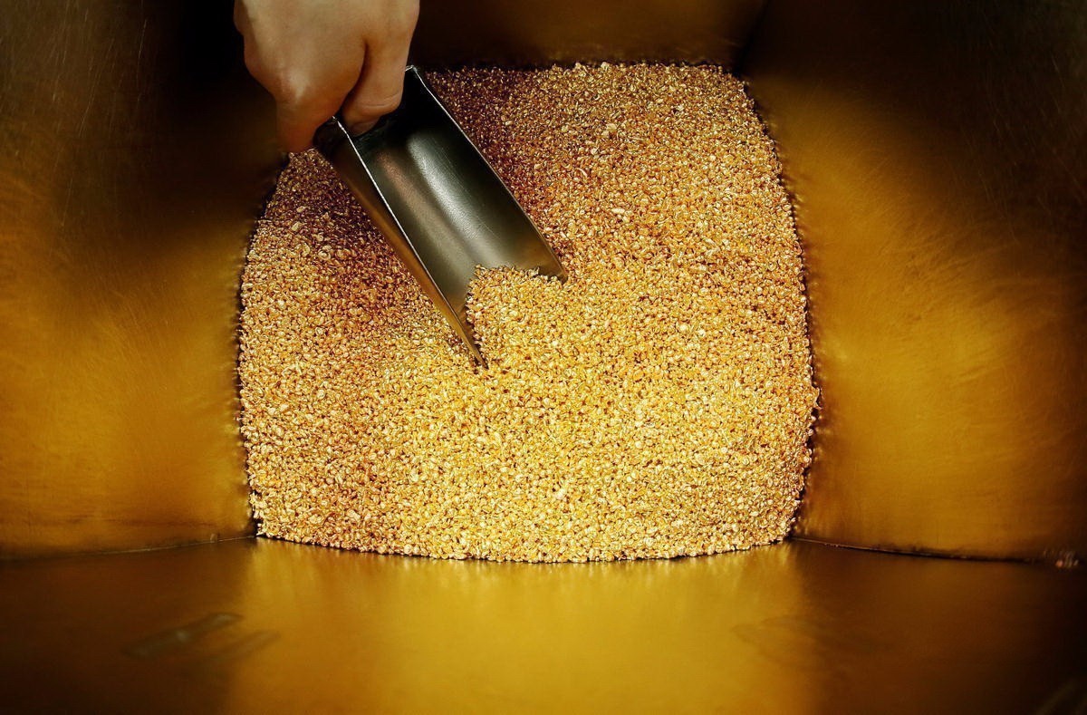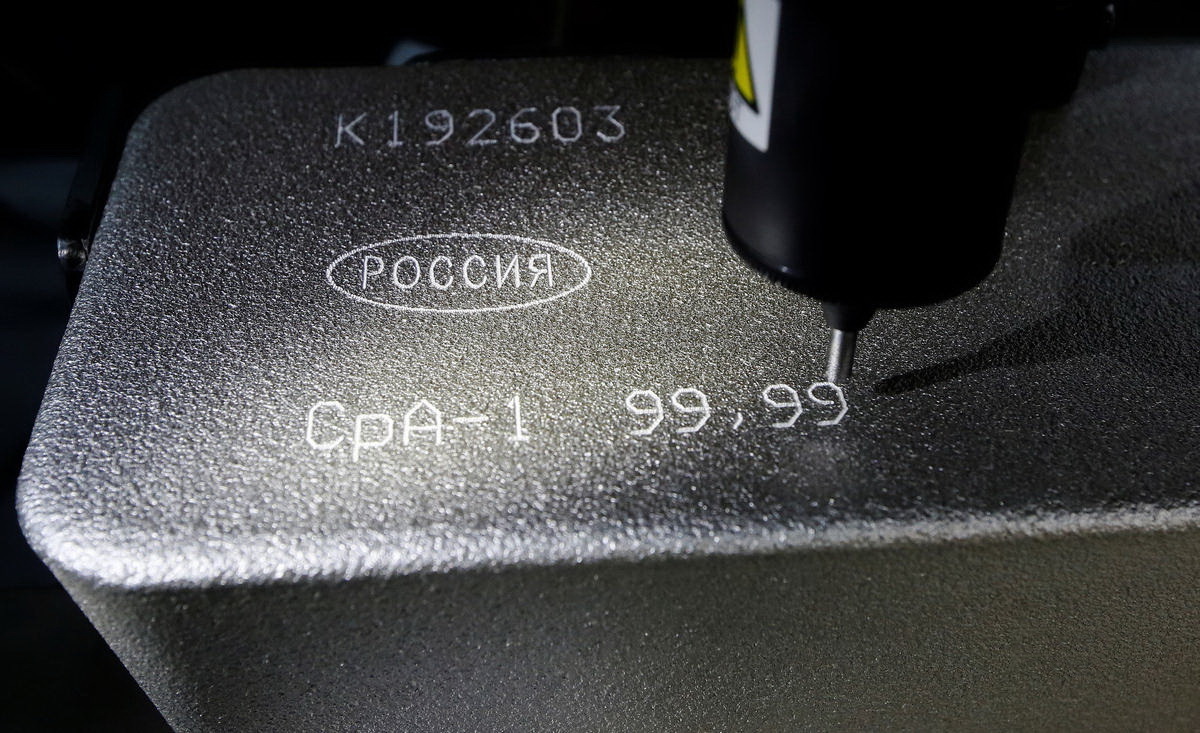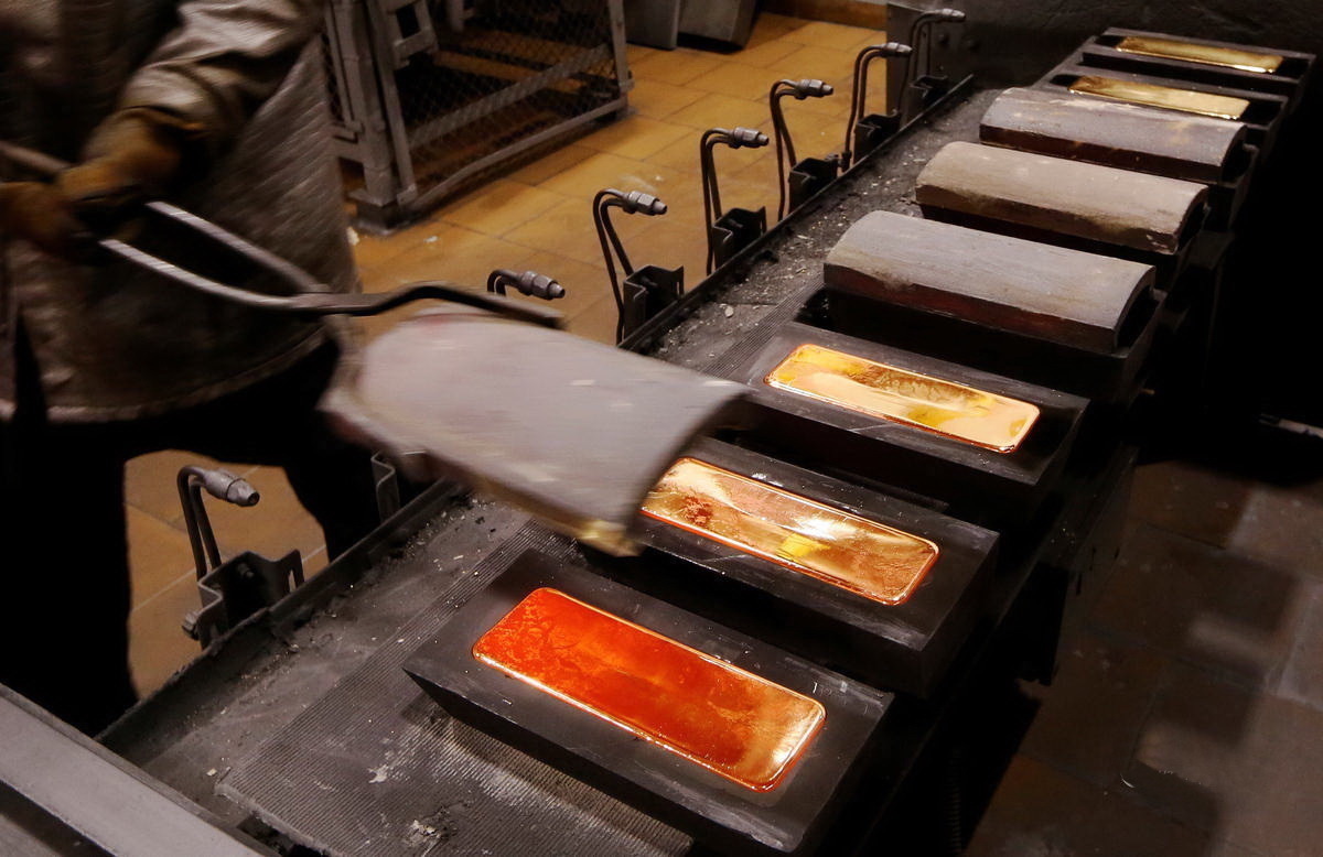 在俄罗斯克拉斯诺雅茨克的Krastsvetmet有色金属冶炼厂内,工人正在码放刚刚制成的金条,这些金条的纯度为99.99%。