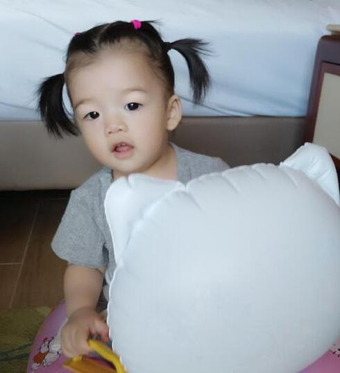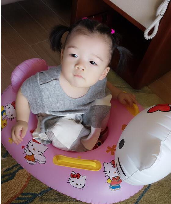 照片中,王栎鑫女儿王唯伊扎着两个小辫子,坐在游泳圈里看着镜头,乖巧可爱。