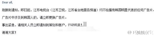有爆料称“限韩令”已经传达给各卫视负责人,要求卫视和省台地面频道均不得播出有韩国明星代言的广告片。