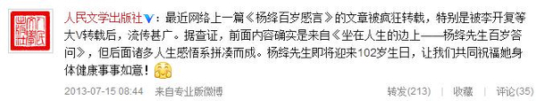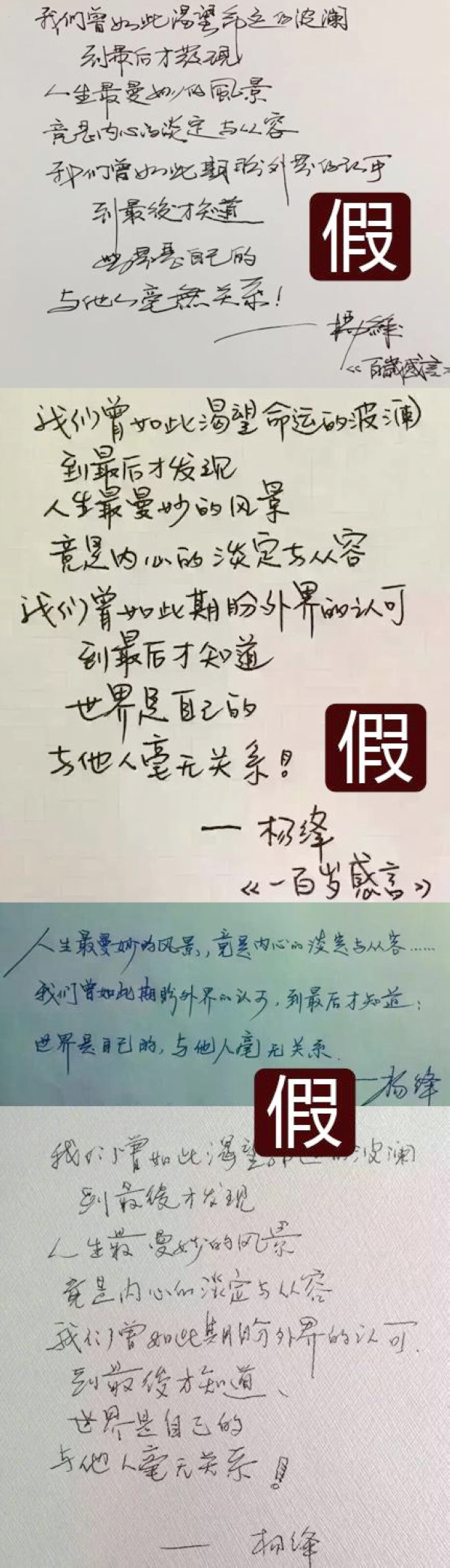 井柏然于2015年将这段手写体杨绛语录上传微博,而此段百岁感言早在2013年就被人民文学出版社辟谣非杨绛所作。
