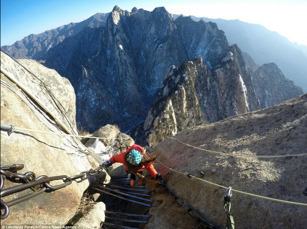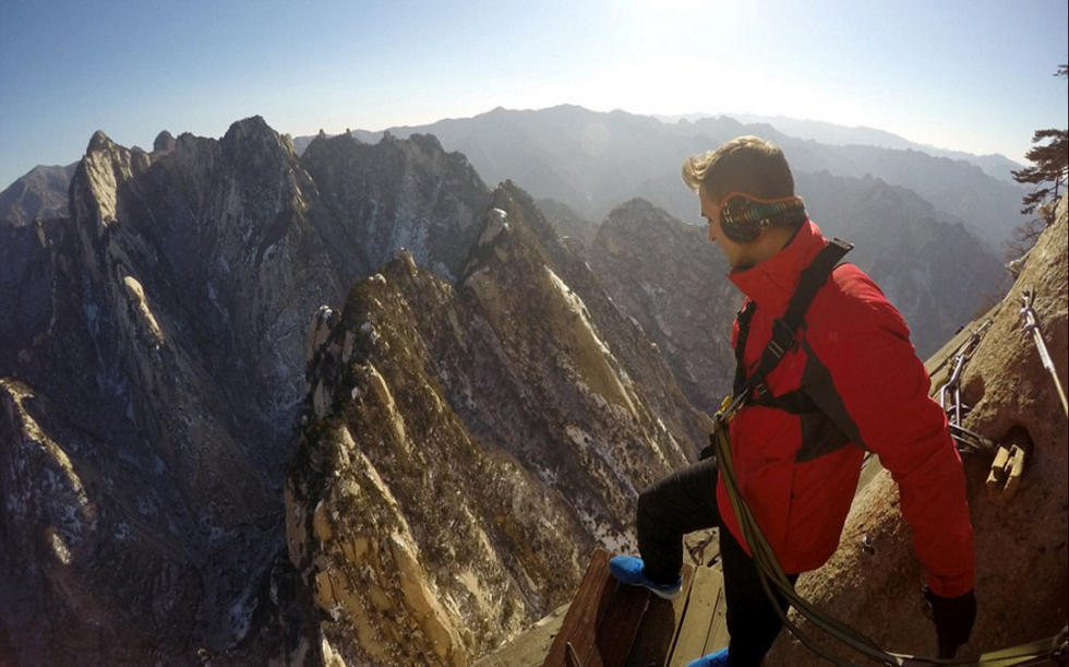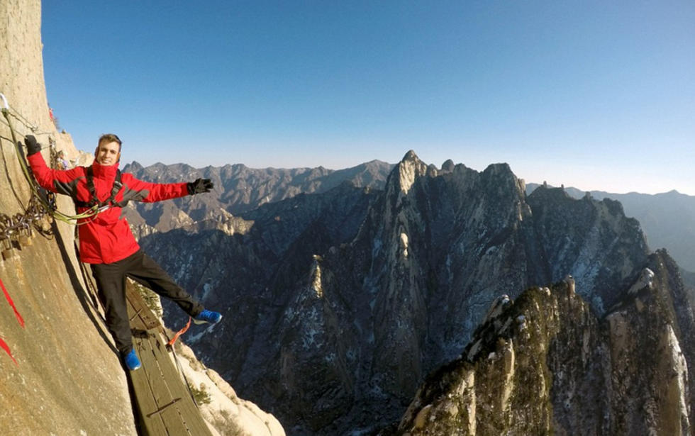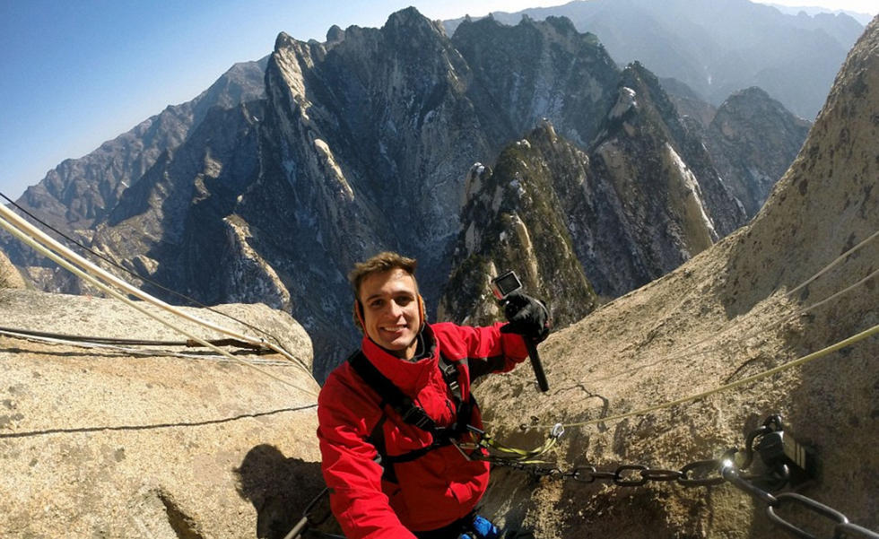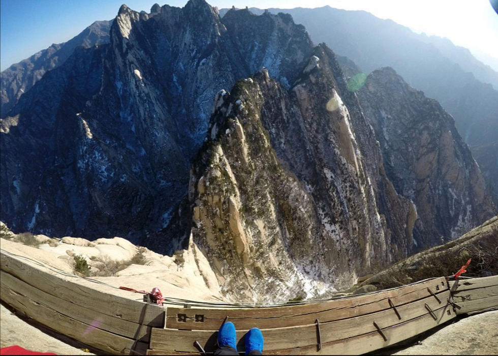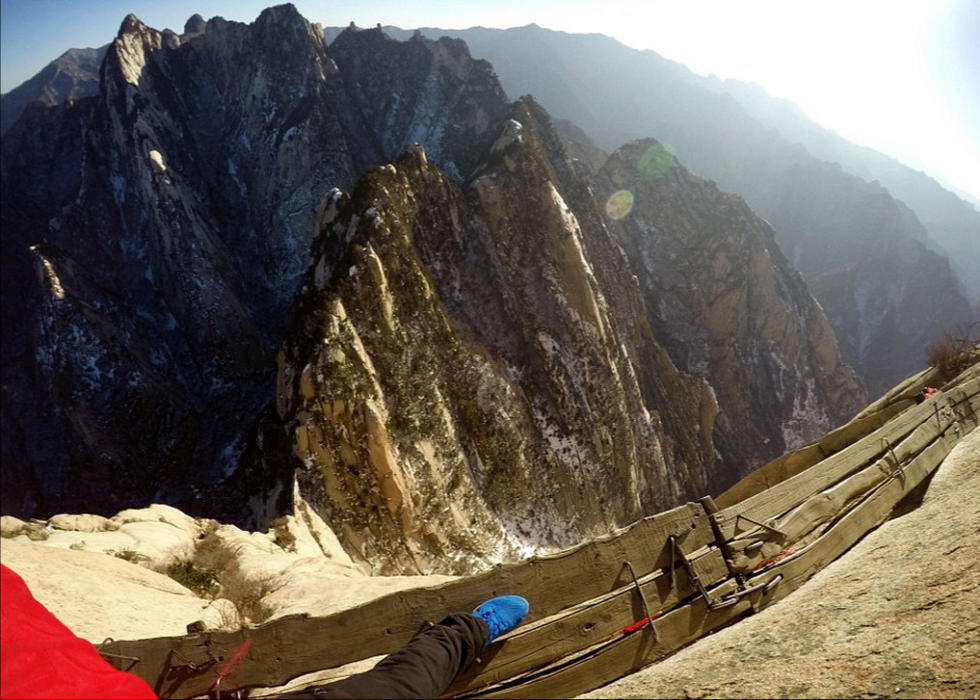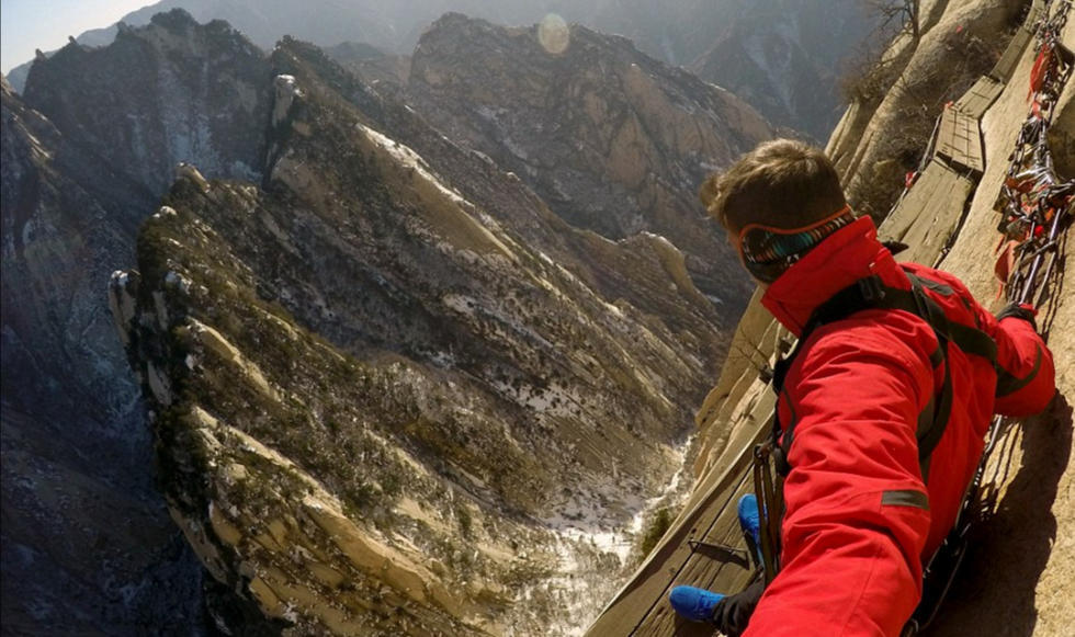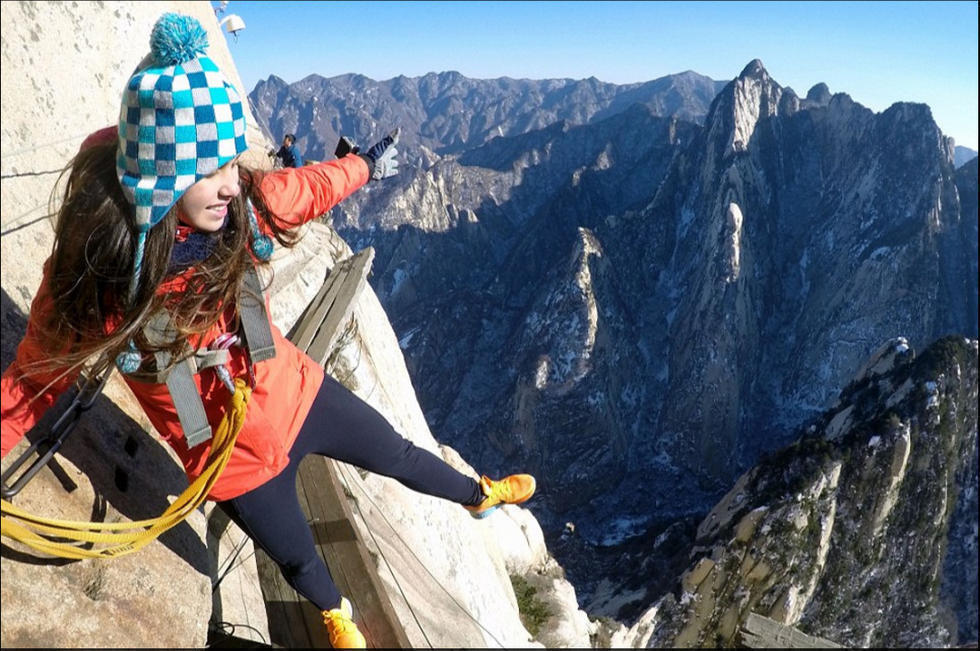 一对年轻情侣在华山狭窄的栈道上玩起了自拍,他们大胆的动作和脚下陡峭的山路形成鲜明对比,让人看了都不禁捏一把冷汗。
