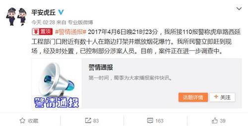 2017年4月6日晚21时23分,派出所接110报警称虎阜路西延工程部门口附近有数十人在路边打架并燃放烟花爆竹。