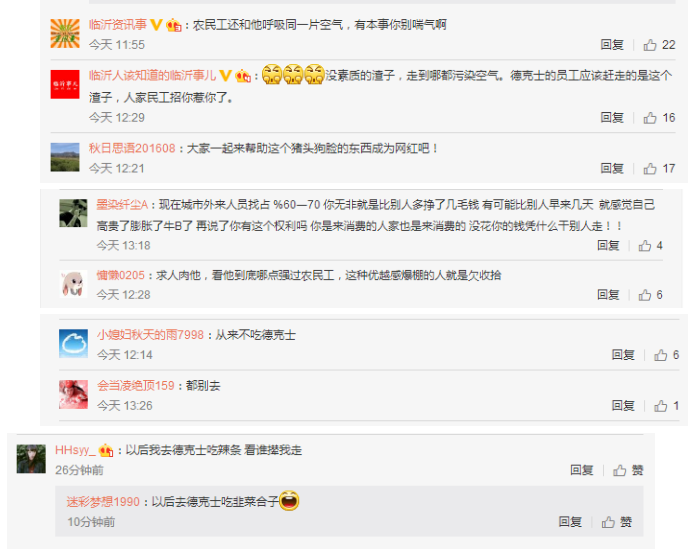 7月31日上午,有网友爆料称山东临沂一家德克士餐厅内,一顾客嫌农民工恶心,便让店员将两名农民工驱赶出餐厅。