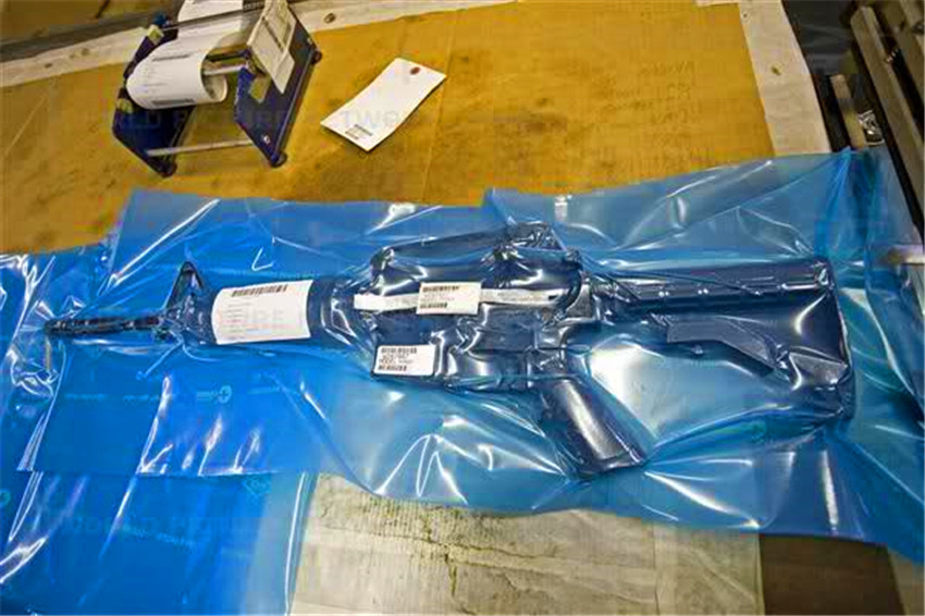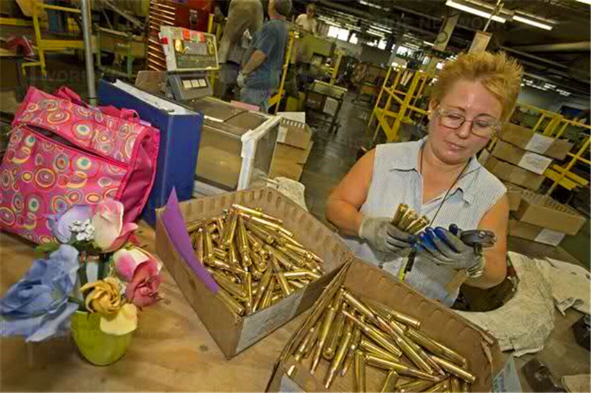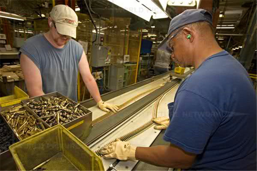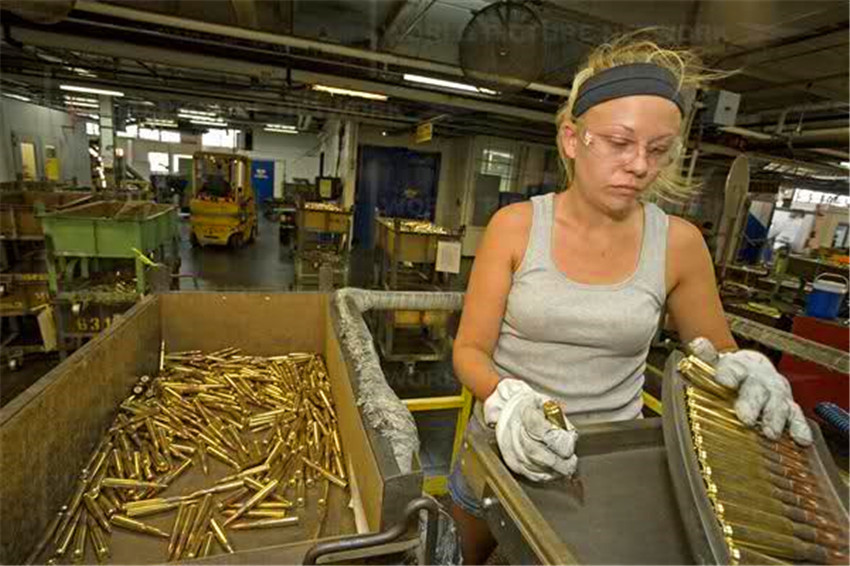 一位Colt(柯尔特)国防军工厂的雇员正工作在M4步枪装配线上。
