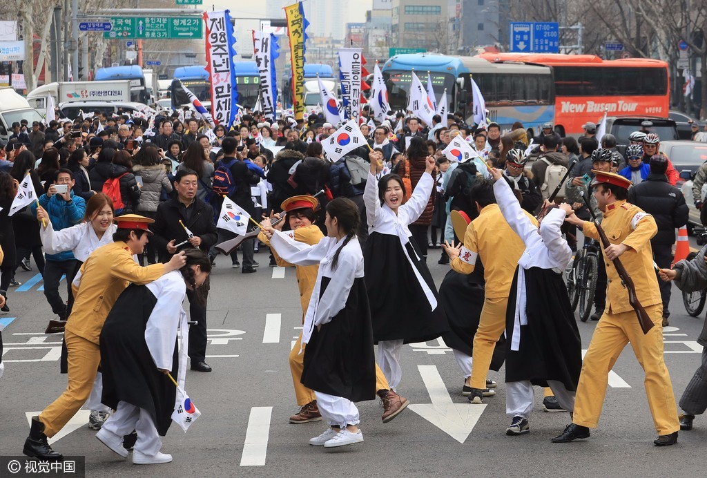 当地时间2017年3月1日,韩国首尔,“三·一独立运动”纪念日当天,活动家扮成二战时期的日本士兵,重现“三·一独立运动”场景。