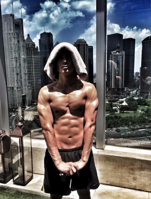 照片中,张晋裸露上身露出巧克力腹肌,身材超性感有料。