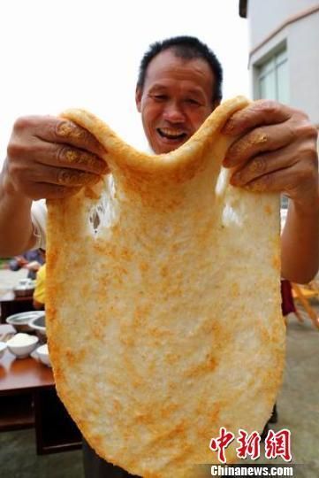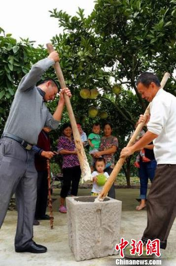 四川省华蓥市永兴镇双龙桥村村民唐建友,与家人在院坝中打糍粑,在开心中迎接中秋节。