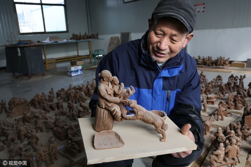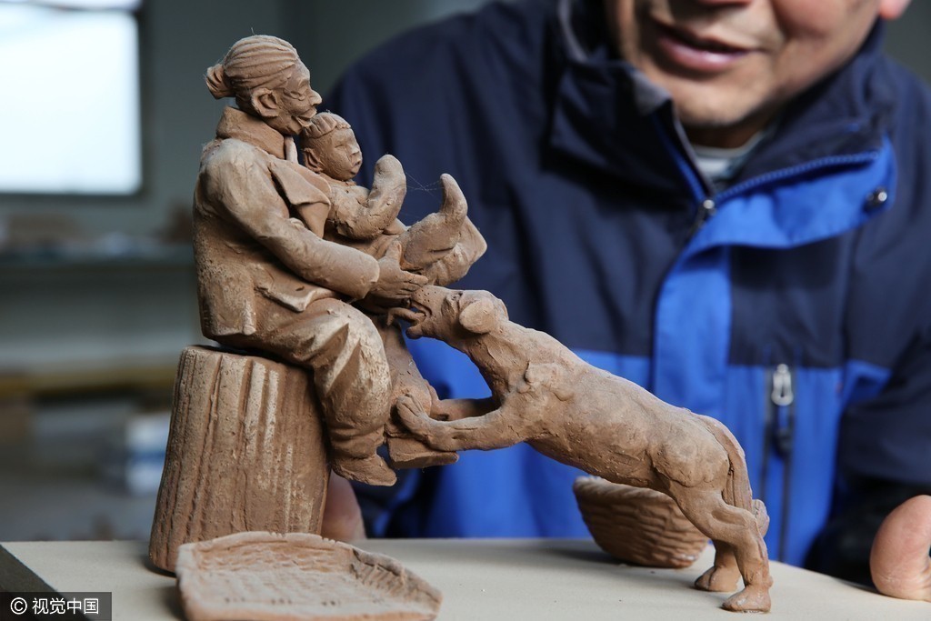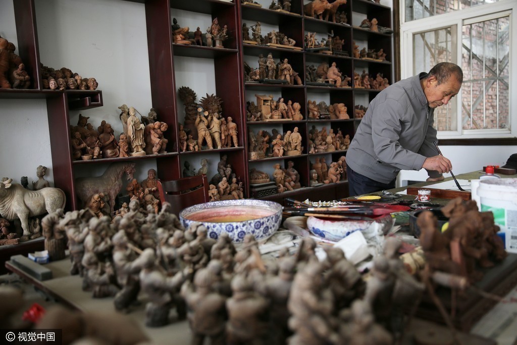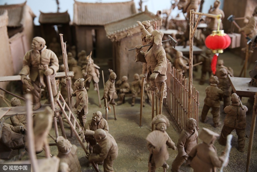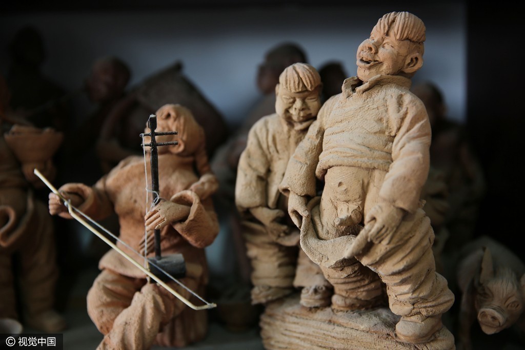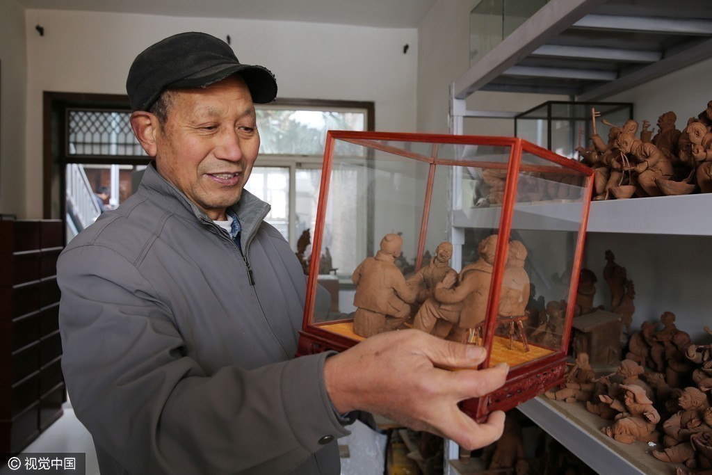 2016年11月23日,陕西省西安市长安区郭杜周家庄村,65岁的农民泥塑达人苗春生天天都在捏泥人。
