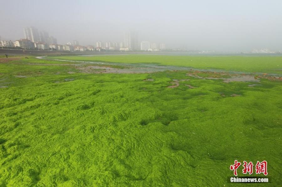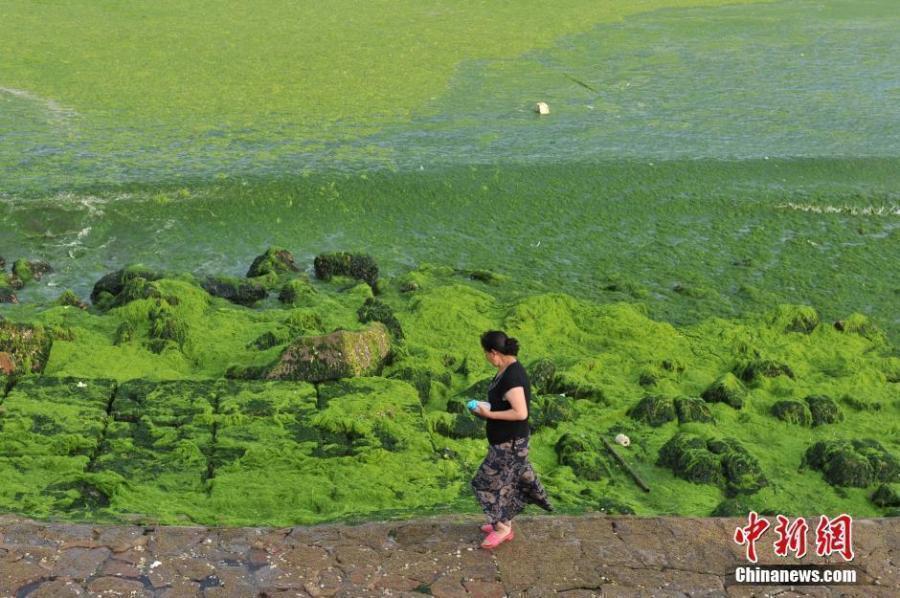 2016年6月29日,山东省青岛市,大片浒苔开始侵入胶州湾入口附近,沿岸一带被绿潮包围,市南区环卫部门加紧打捞处理