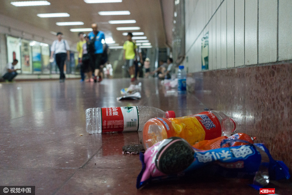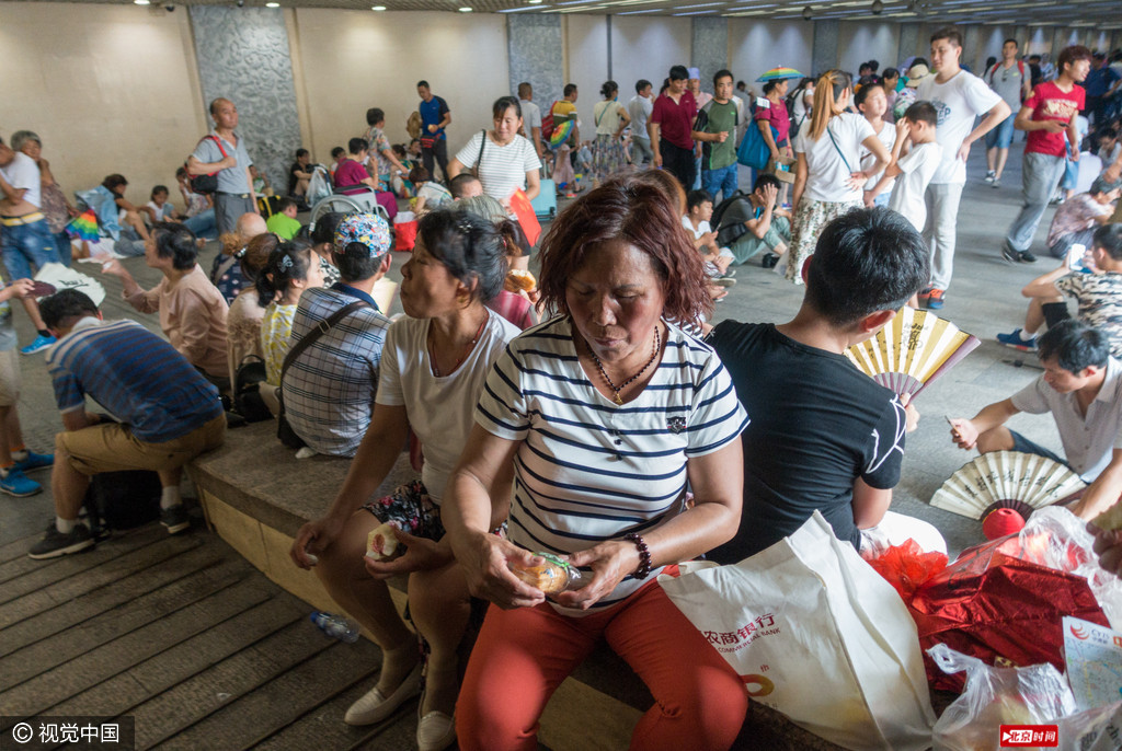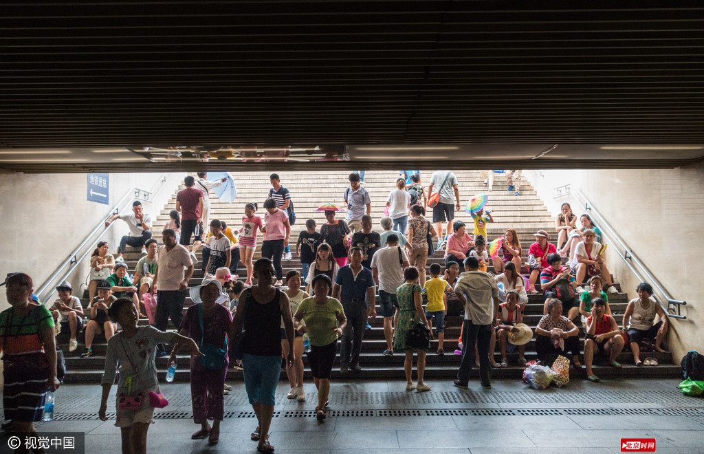 北京当日气温达到零上33度,正午时刻,游览北京天安门的一些游客躲避炎热,在天安门广场东地下过道和地铁楼梯内休息。