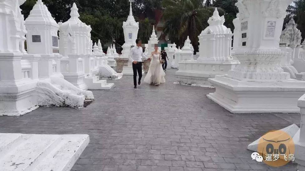 看见一对中国游客穿着婚纱礼服在安放着泰王骸骨的佛塔处拍婚纱照,两人互相追逐嬉戏,还对着佛塔扔捧花。