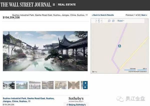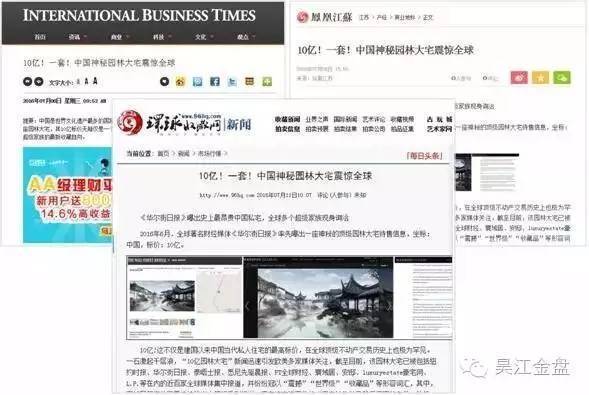 2016年6月7日,全球著名财经媒体美国《华尔街日报》以“来自中国的最贵私宅”为题,曝光一座标价10亿的顶级中式园林大宅,随即引发纽约时报、泰晤士报、悉尼先驱晨报、FT全球财经、寰域居等欧美近百家权威媒体关注报道。