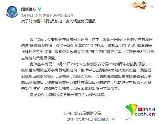 公安机关在日常网上巡查工作中,发现了一网民"不朽的少年有放逐的梦"通过微博上传了一段记录出租车驾驶员被抢劫整个过程的视频。