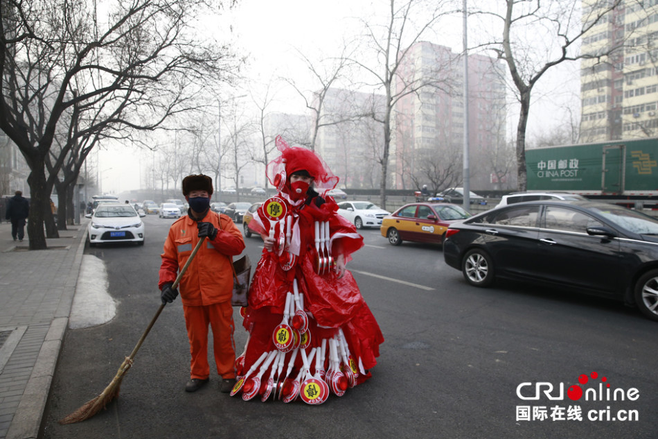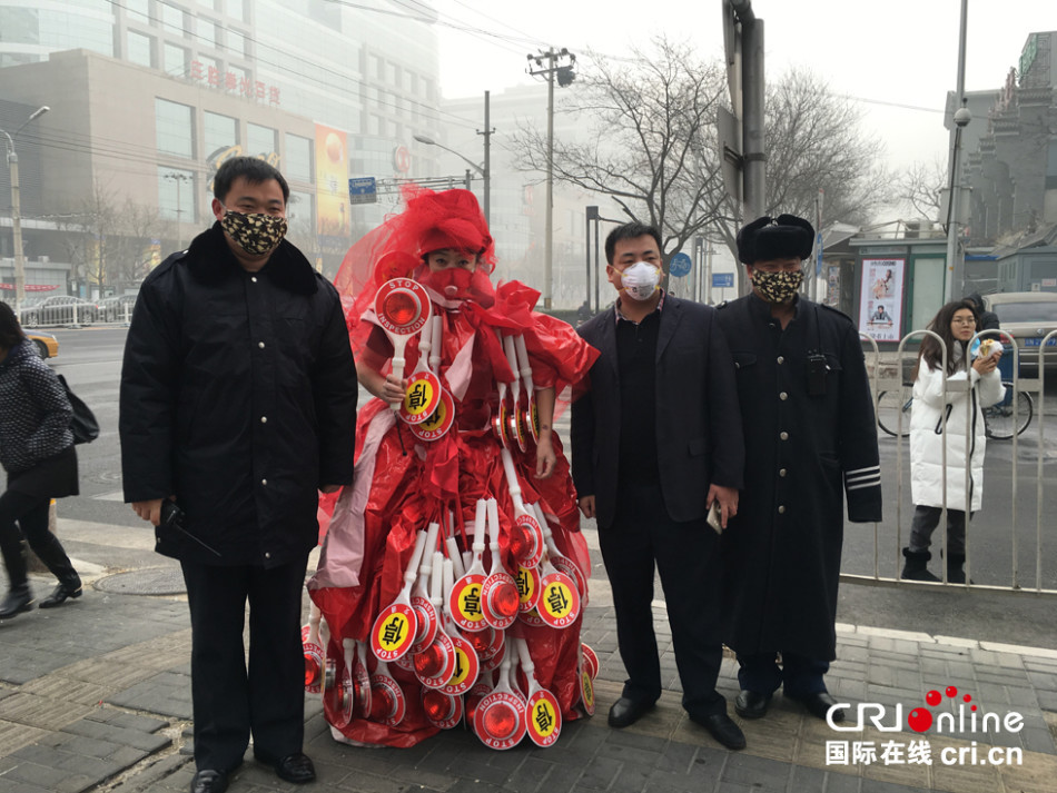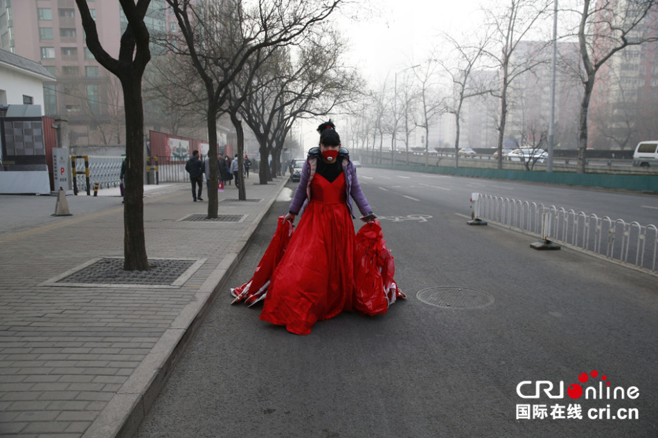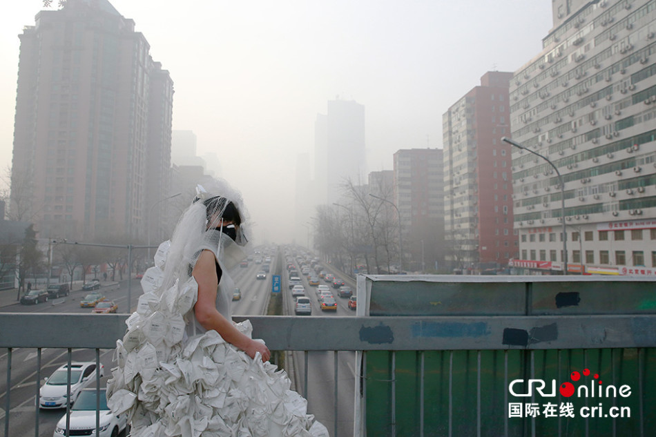 孔宁她穿起带停止和红灯的婚纱走在北京街头,希望市民出行保护好自已,并希望雾霾尽快散去。