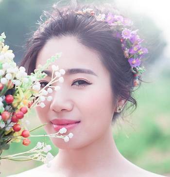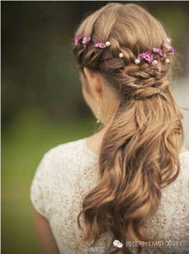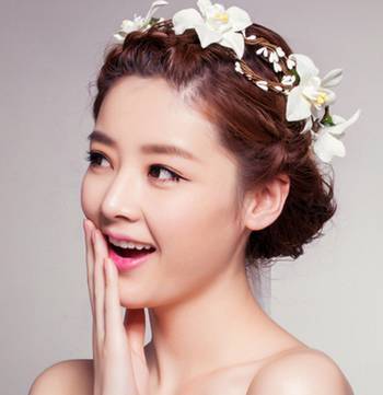 甜美且时尚的编发盘发发型,清爽的无刘海发型给人一种别致的清爽与秀丽,十分讨喜。白色的花环点缀后更显清新与素雅。