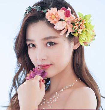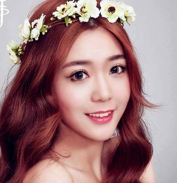时尚的中长发烫发发型,这种个性的棕红色发色的打理,不仅优雅而且颇显肤白,披肩发型与唯美的花环搭配起来,不仅浪漫而且颇显童话范。