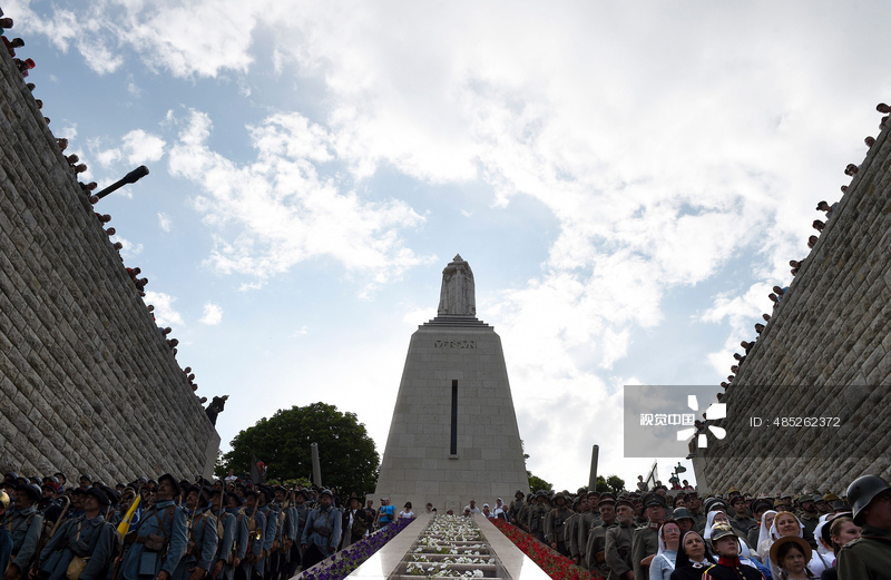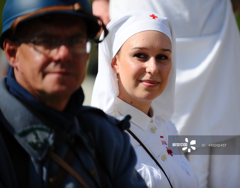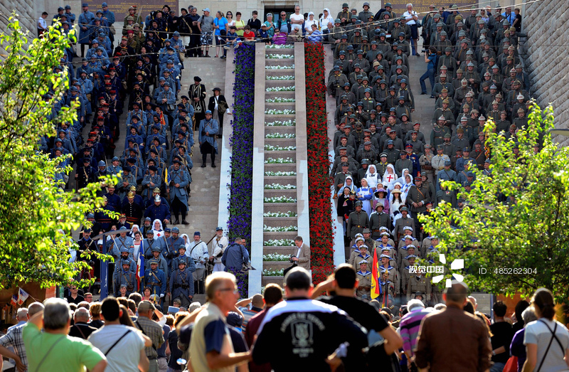 5月27日,法国凡尔登,历史爱好者装扮成一战中的德国和法国士兵,重现凡尔登战役。
