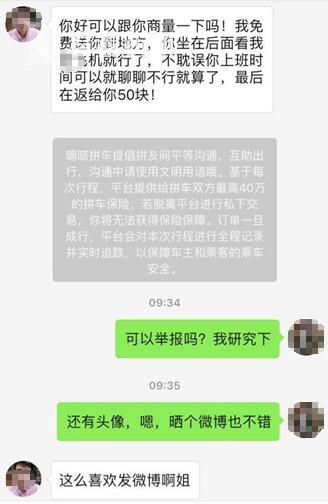 据当事人小张介绍,“这个司机联系我之后,一上来就给我发了这个消息。”信息内容大致如下:可以跟你商量一下吗?我免费送你到地方,你坐在后面看我*飞机就行了,不耽误你上班时间,可以就聊聊。