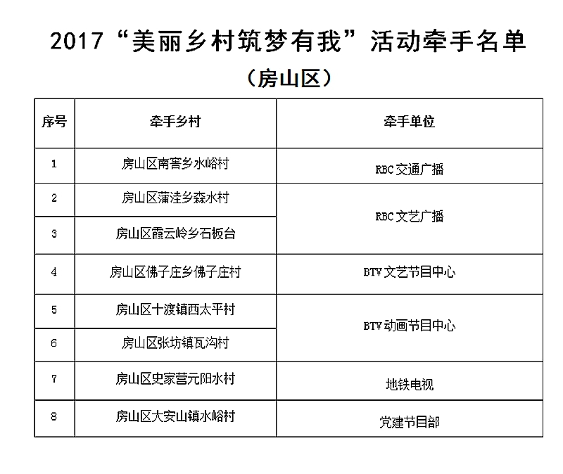 北京广播电视台以所属北京人民广播电台总编室及9个专业台、北京电视台总编室及11个节目中心,北京新媒体集团、以及歌华有线、歌华文化、数字电视、移动电视、地铁电视、城市电视、新新传媒、电视报社等单位为牵手主体,与北京市远郊6个区的50个低收入村牵手结对。