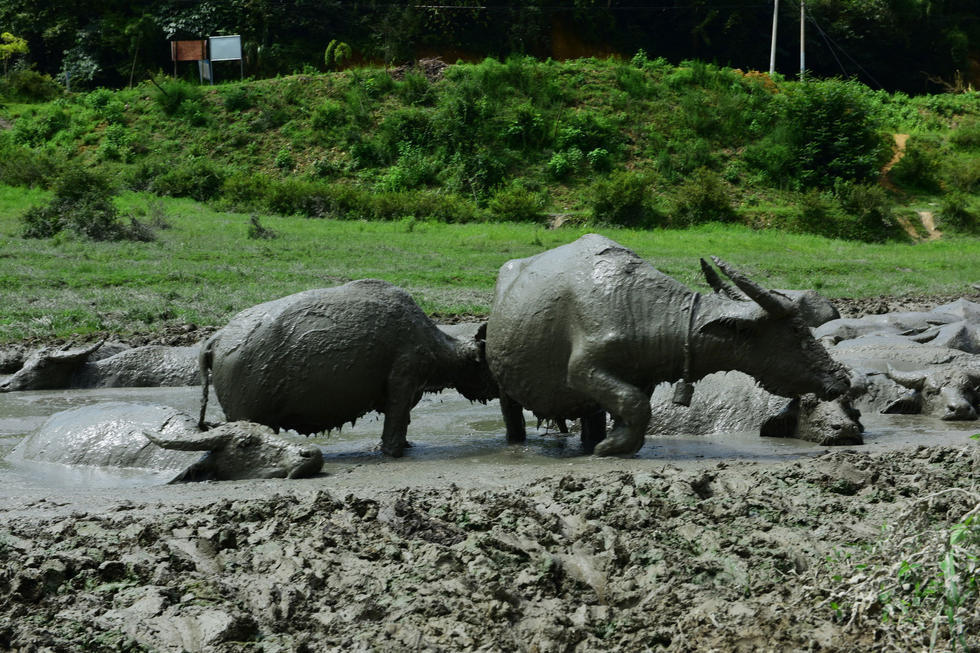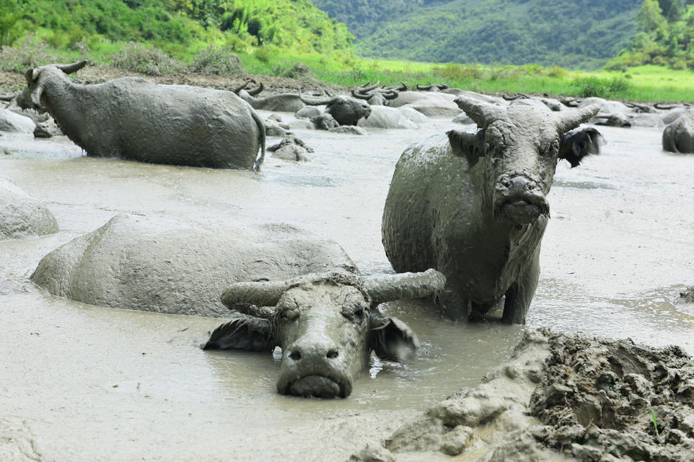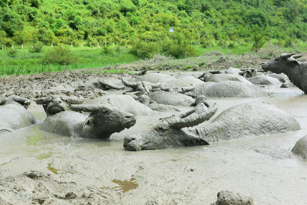 水牛们用这种独特的方式降温消暑,减少蚊虫的叮咬,享受高温下的难得清凉。