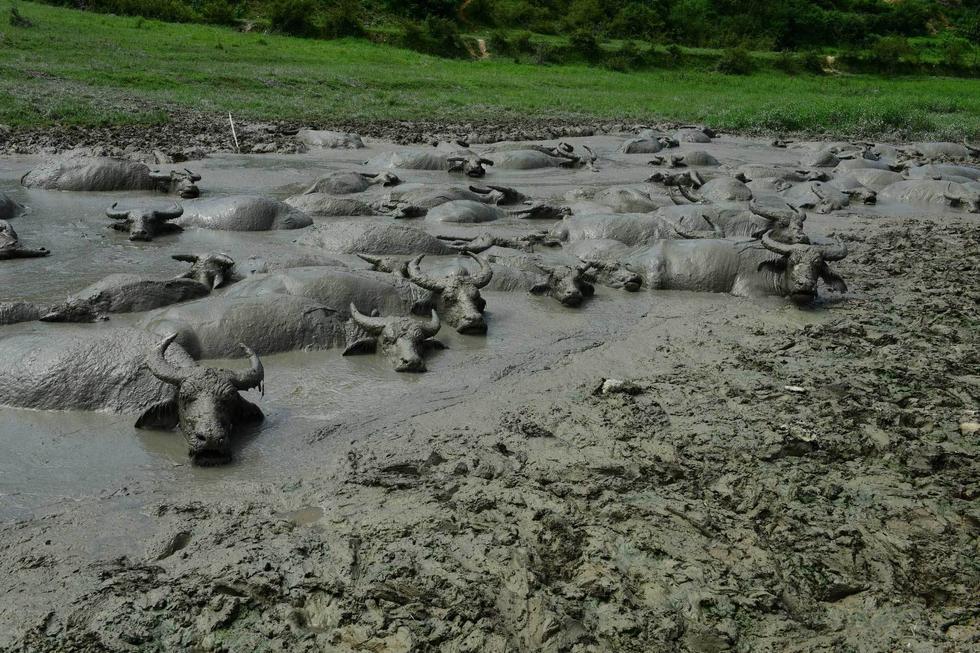 在湖北省恩施土家族苗族自治州宣恩县椒园镇洗草坝村,上百头公、母水牛集结,在大坝有限的黄泥塘里,用黄泥覆盖全身,共洗“黄泥鸳鸯浴”。