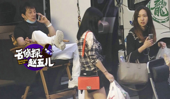 到了饭点,两个年轻时尚的长腿美女提着大兜食物过来送温暖,成龙依然悠哉地翘着脚打电话,还不忘跟美女招手。