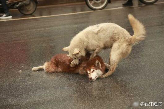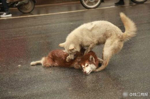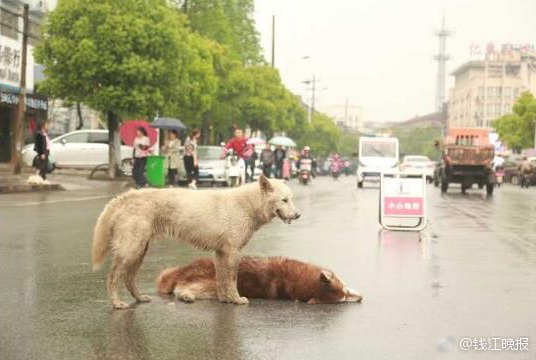 浙江省衢州市衢江区廿里镇中兴路出现感人一幕:一只狗被汽车撞死横卧路中,另一只狗不顾危险,呜咽着蹲守在同伴身边半个多小时不愿离去。