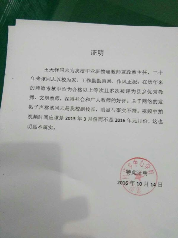 而学校开具的证明指出,王天铎并非该校副校长,只是一名普通教师。而且,图像的拍摄时间也并非2016年元月,应为2015年3月。