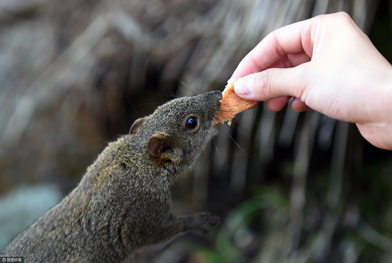 2017年4月20日,安徽黄山景区,一只松鼠从树林中跑出来,试探着食用游客掉在地上的面包渣,并站立起来食用从游客手中的面包。