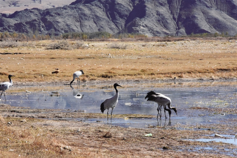黑颈鹤为什么会选择以这样的队形来迁飞呢?记者了解到,其实,几十年来,这个问题一直都没有确定的答案,倒是有许多猜测,其中队形与定向有关,按一定队形迁飞的行为与降低迁徙飞行的能量消耗有关这两种答案比较普遍。