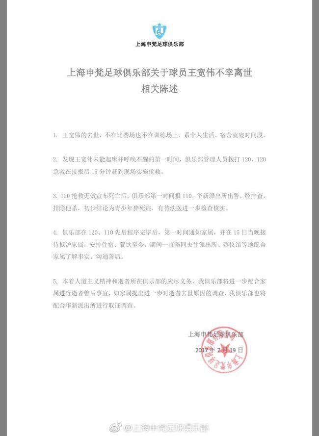 球员王宽伟,因病于2017年7月15日凌晨去世。随后网络流传的对于该队员的死因猜测,傍晚俱乐部通过微博正式做出声明。 俱乐部表示王宽伟系在睡眠中去世,早上起床呼唤不醒后,第一时间采取了抢救措施。初步判定为青少年猝死。
