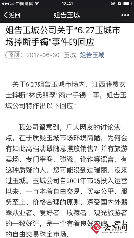 事发后,游客愿意赔付的金额从1.5万元上调到3万元,但第三方对损坏的手镯评估价值为18万,经多次调解未果,涉事双方将走司法程序解决。