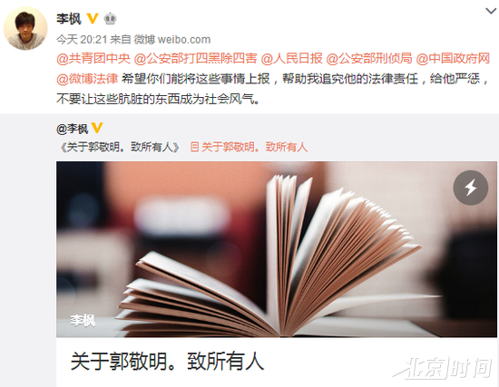 8月21日晚,作家李枫爆料曾遭郭敬明同性性骚扰,还称郭敬明经常骚扰、性侵犯签约到郭敬明公司的男作者、公司的男性职员。
