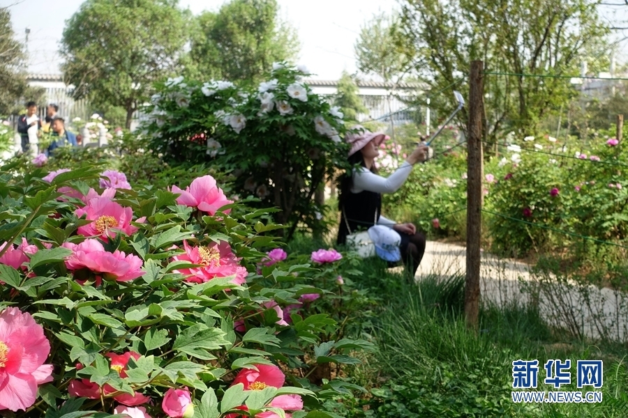 4月10日,游客在河南省洛阳市国家牡丹园(国家牡丹基因库)与牡丹合影。新华网发 许建梅摄