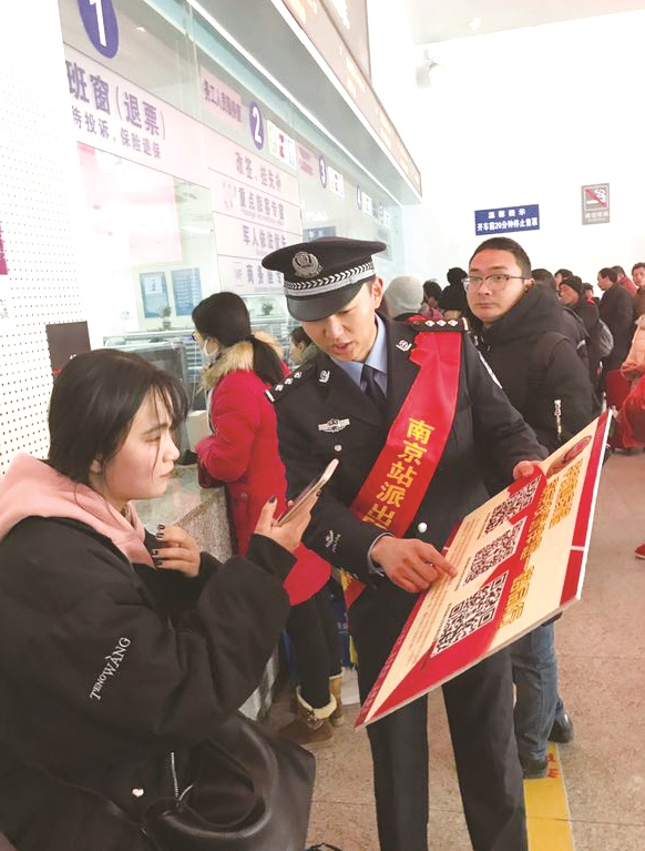 2018年春运首日,为进一步打造“平安春运、有序春运、温馨春运”,南京火车站派出所百名民警开启春运安保“40天大考”模式。在辖区的南京火车站和仙林火车站及铁路沿线,吹响了“春运安保冲锋号”,誓言交出“春运安保满分答卷”。