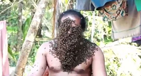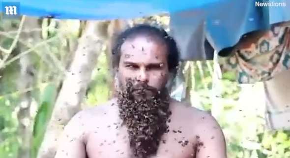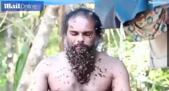 近日,美国一名男子的举动让众网友们目瞪口呆 他让数千只蜜蜂爬上自己的脸当作胡子,而自己则正襟危坐,毫无惧色,一动不动。