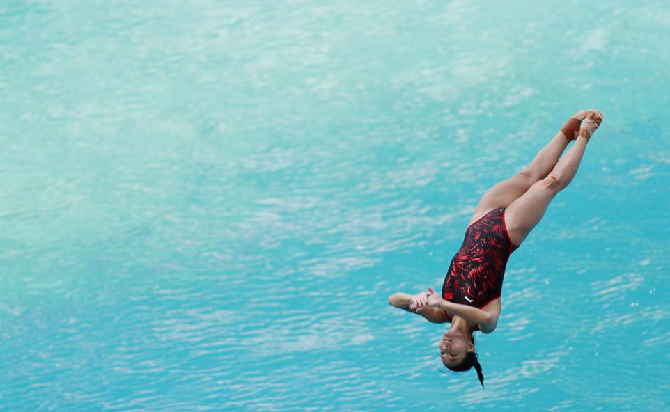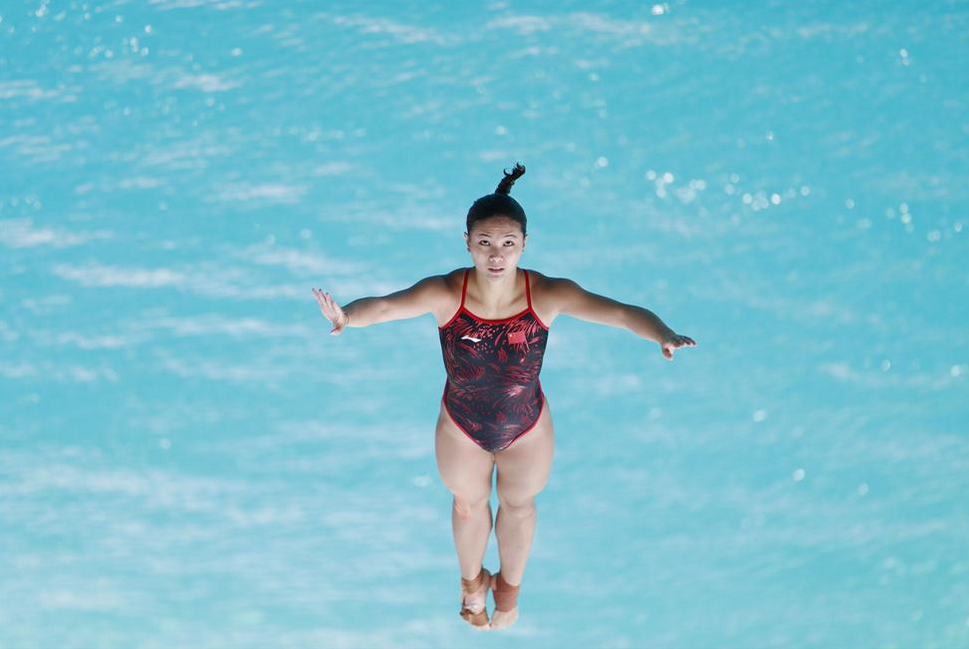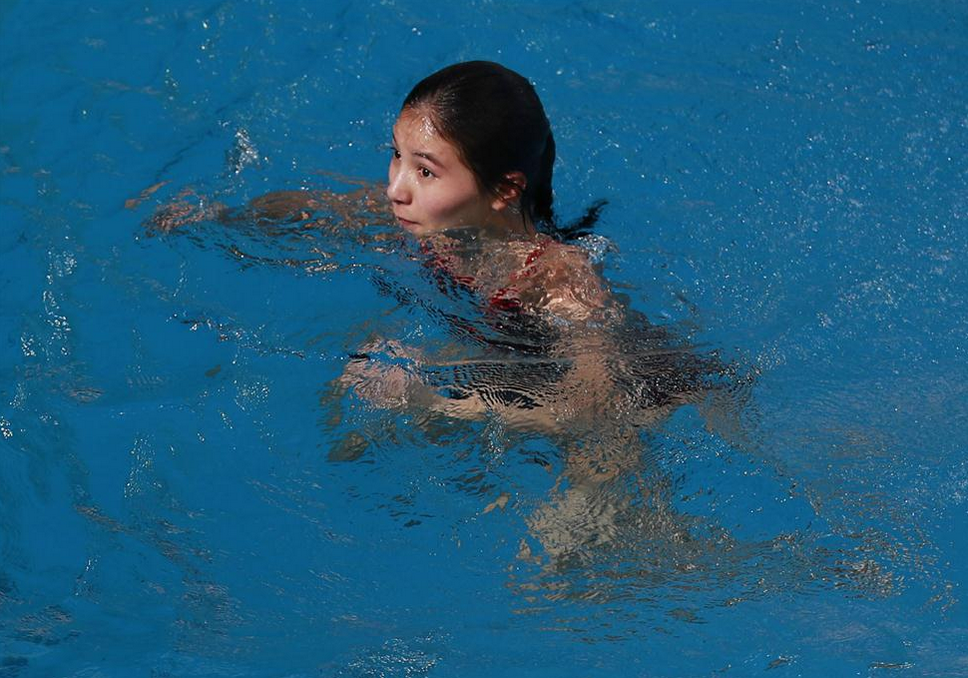 8月4日,中国跳水队队员何姿在玛利亚·伦克水上项目中心进行场地适应性训练。