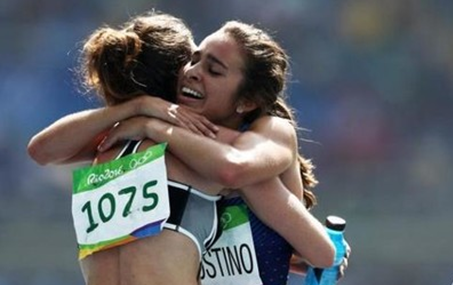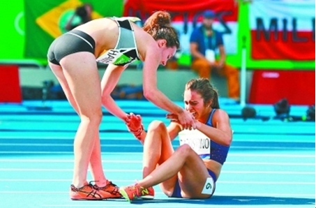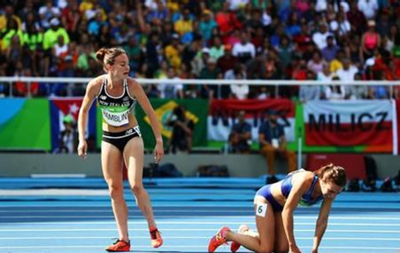 在女子5000米跑中,新西兰女队员汉布林突然倒在了地上,而在她身后的美国选手阿比达戈斯蒂诺躲闪不及,也随即倒地。