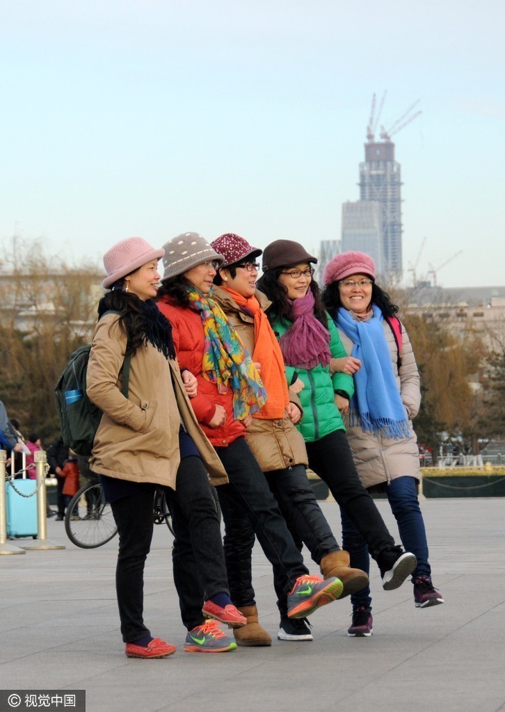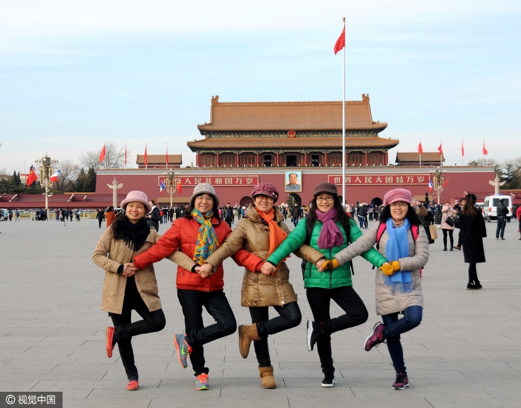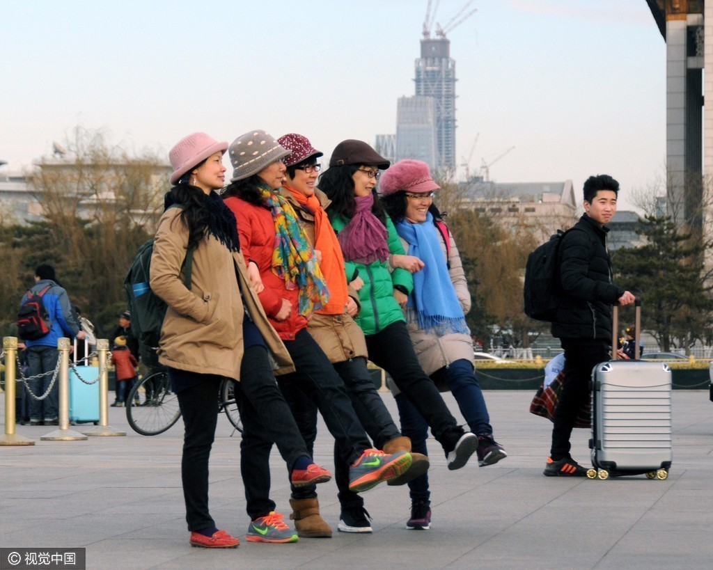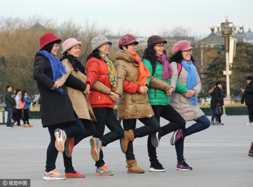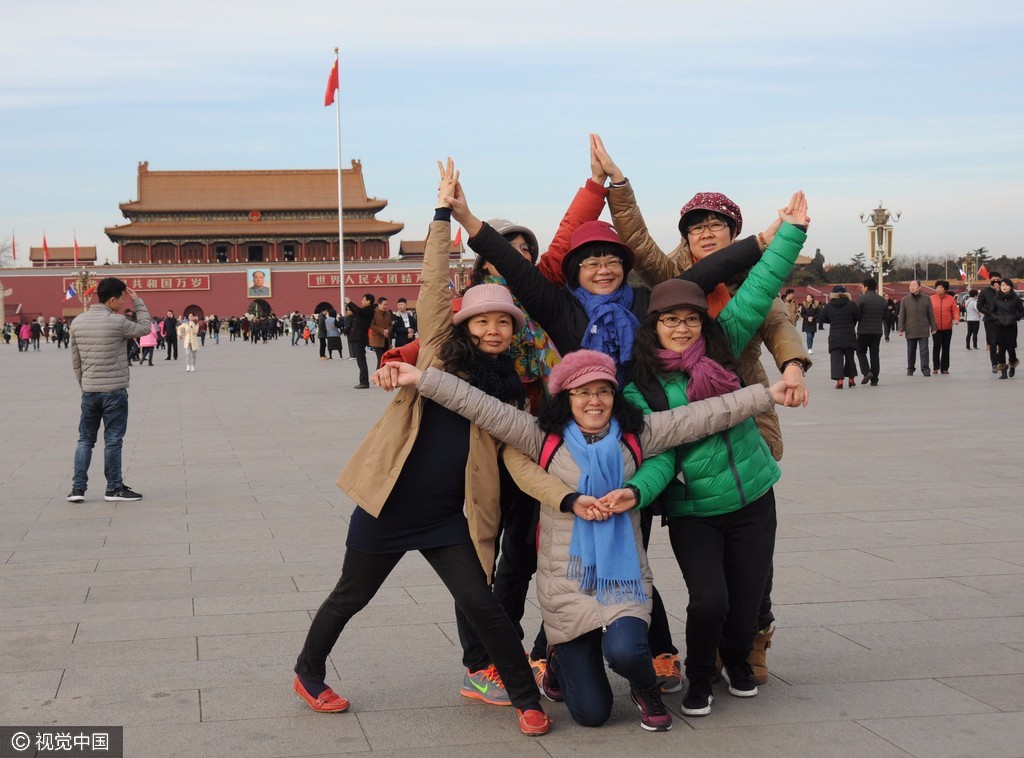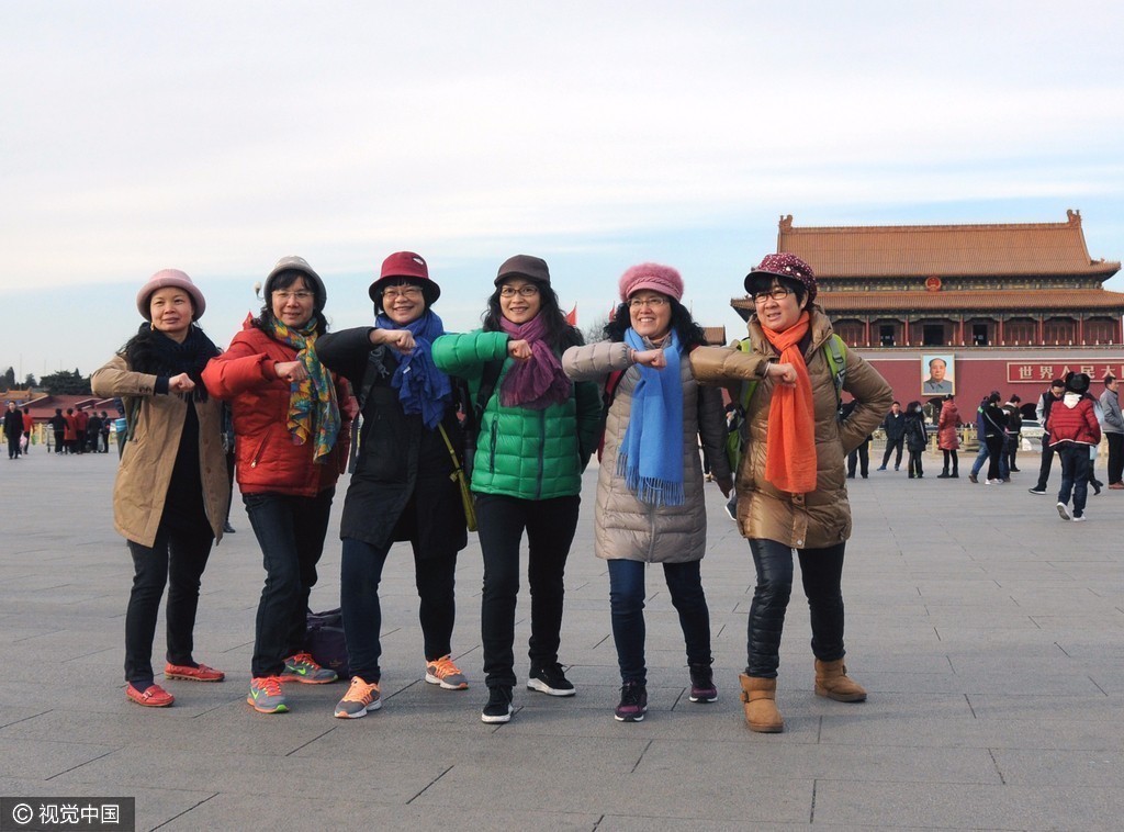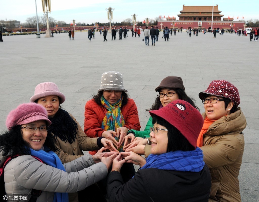 几位中老年女游客在此摆出各种造型拍照留影、欢乐有趣,成为初春一道充满活力的别致风景,吸引了过往游人的目光。