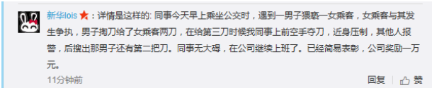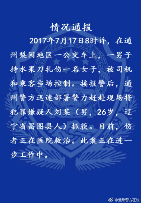 17日上午,有网友发微博称,在通州582路公交车上,有男子猥亵女子,该女子与其发生争执,男子随后掏出水果刀扎了女子两刀,司机和乘客随即制服了行凶男子。该女子目前失血性休克,正在医院救治。