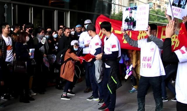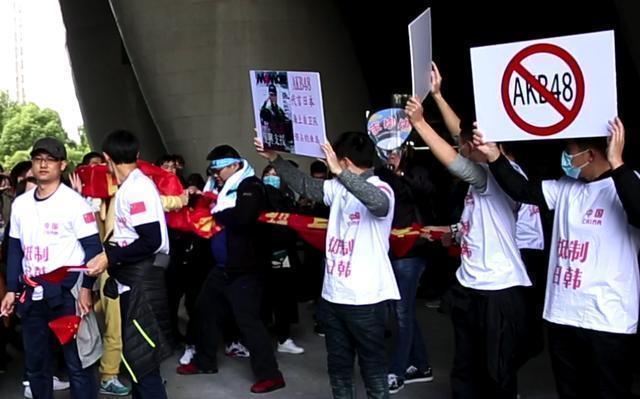 爱国人士举横幅抗议。AKB48是日本最大的国民偶像组合,在日本有很大影响力。在海外的影响力也不容小觑,近两年却丑闻不断。