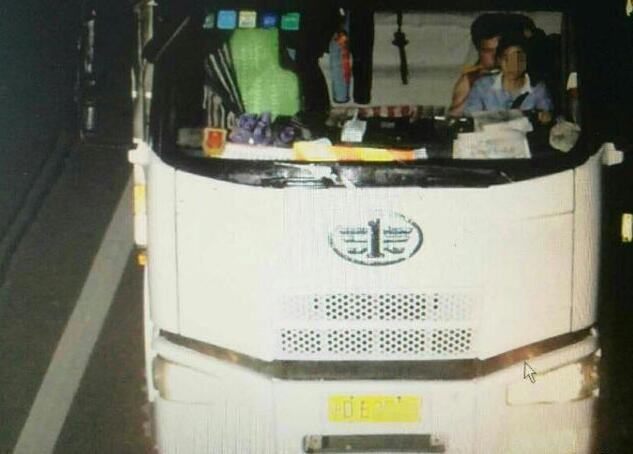 驾驶室驾驶员座位上叠坐着两个人,女的在前手握方向盘在驾驶大货车,男的在后正在看手机,有严重妨碍安全驾驶的嫌疑。