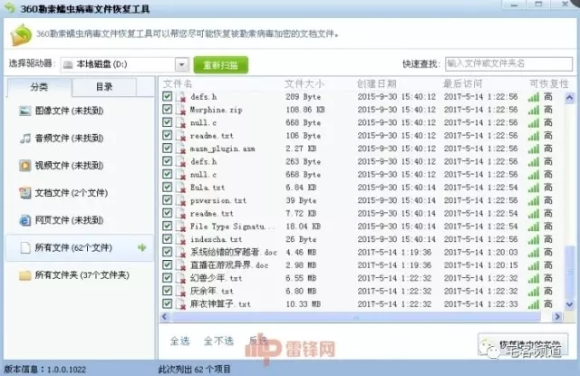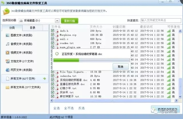 今天(5月14日)凌晨2点18分,360安全卫士突然在微博上发布了一个360勒索蠕虫病毒文件恢复工具(文末有下载链接),声称可以恢复部分被勒索软件加密的文件。恢复流程大致如下。