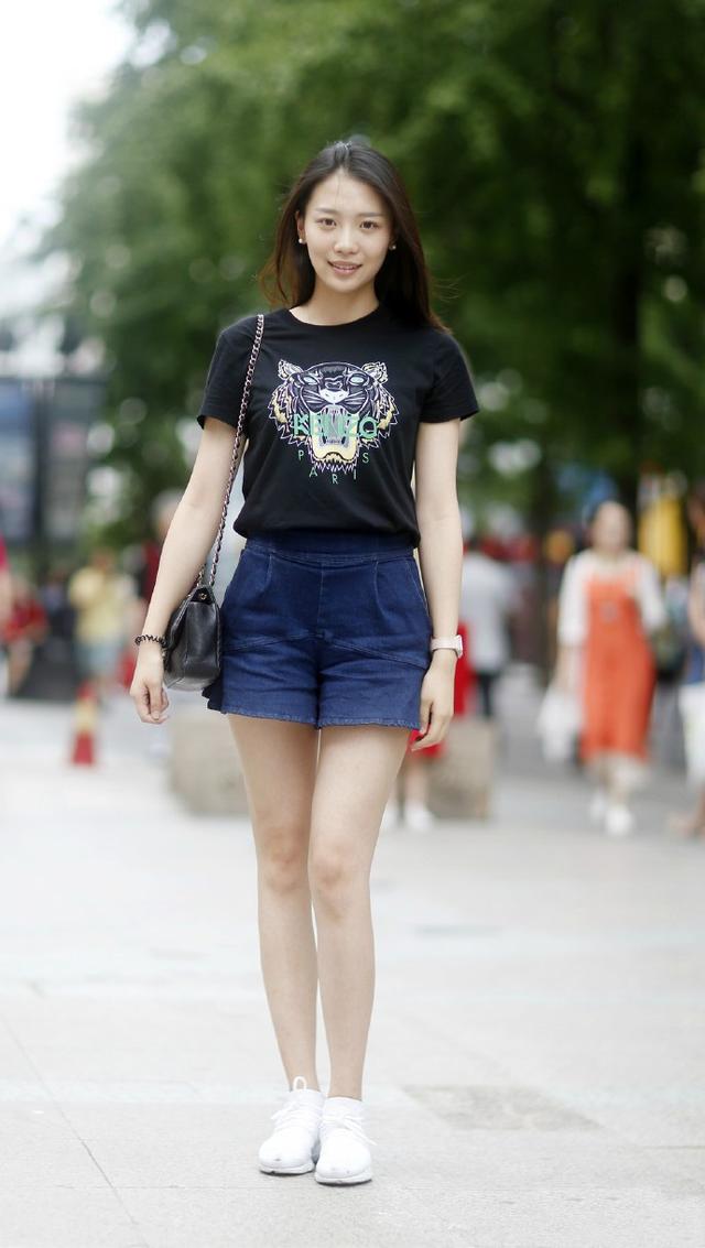 这位美女其实也是很普通的穿搭,其实想要懒一点就最好选择黑白色了。因为黑白色是最不容易犯错误的颜色了,上身穿一件带图案的黑色T恤,脚下一双白色的运动鞋,就是夏日最简单而又不犯错误的牛仔短裤穿搭法了。