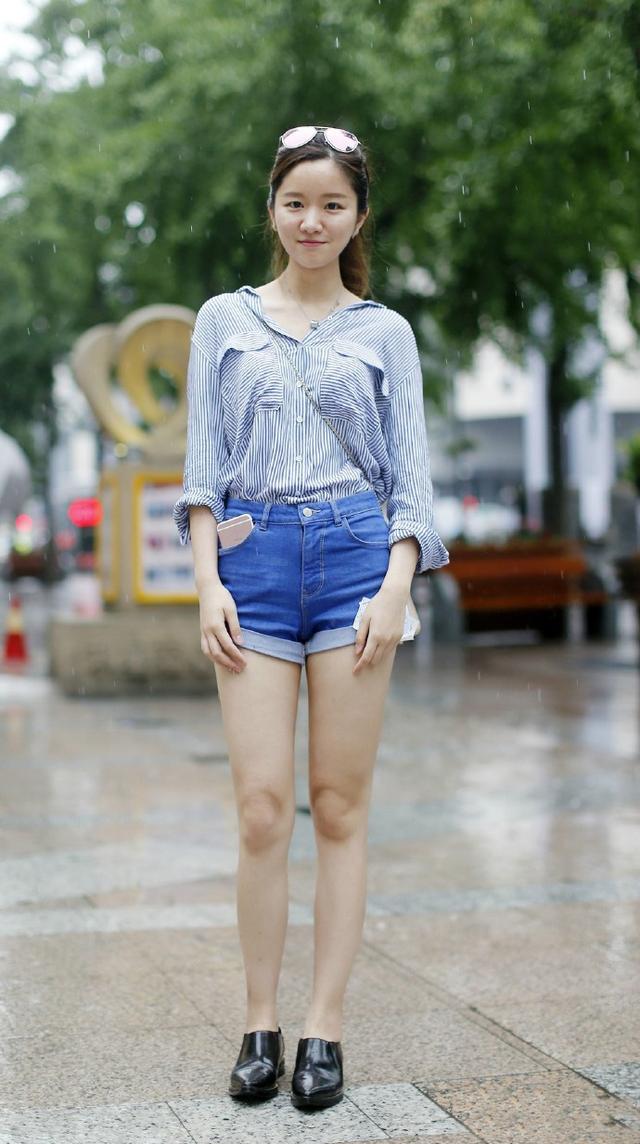 采用跟牛仔色接近的蓝色条纹衬衫搭牛仔短裤,发现这位美女的眼光真心不错。对服装色系的把控很好。小裁缝表示抛却黑白灰基本色,其实这位美女搭得是最好。时尚感很强。