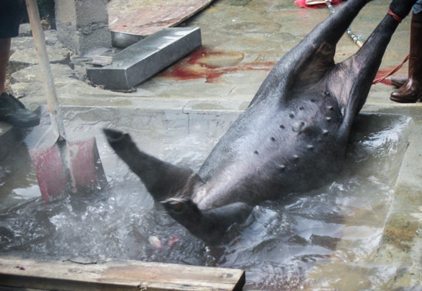 农民大叔白刀子进红刀子出,猪血流得非常快,马上就用面盆接着,这可不能浪费啊!