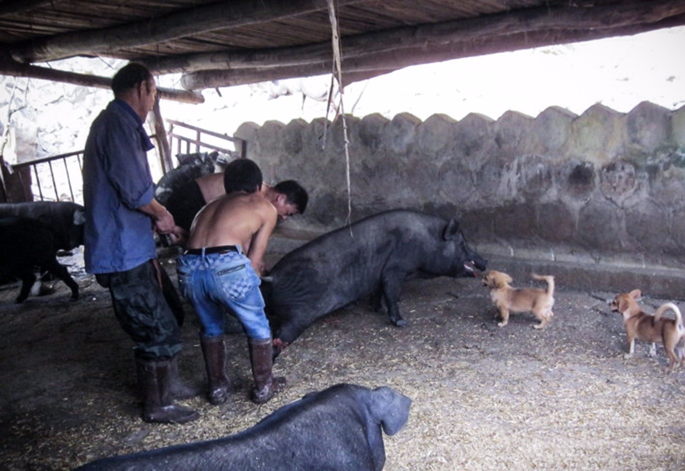 村里这只猪挺肥的,没有几个人可不好弄出来,几个小伙都弄得大汗淋漓的。