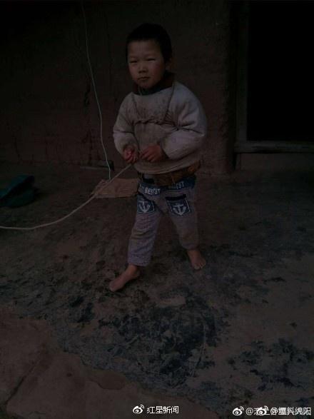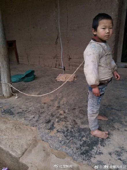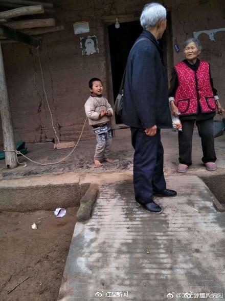 小朋友可能患有自闭症,父亲、奶奶管不住,只能长期像狗一样拴住他,这样一个本该在学校上学的孩子却像动物一样没有自由。